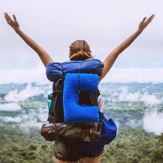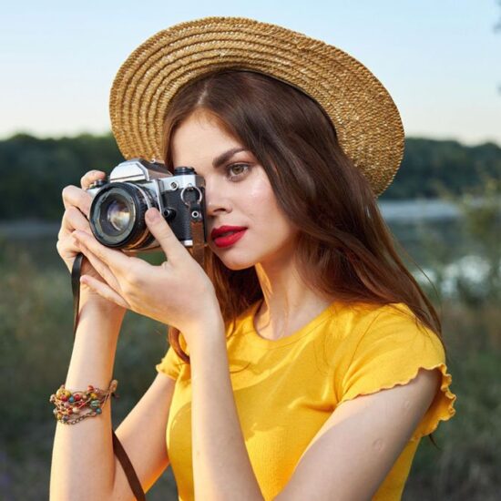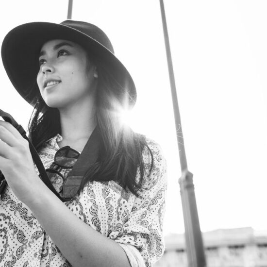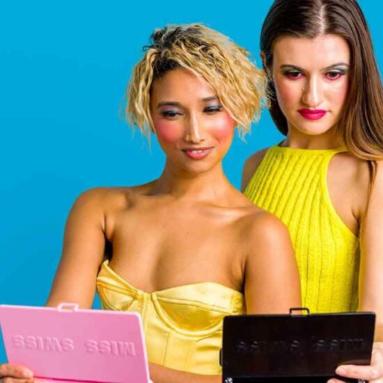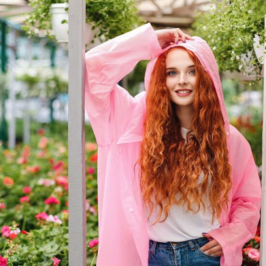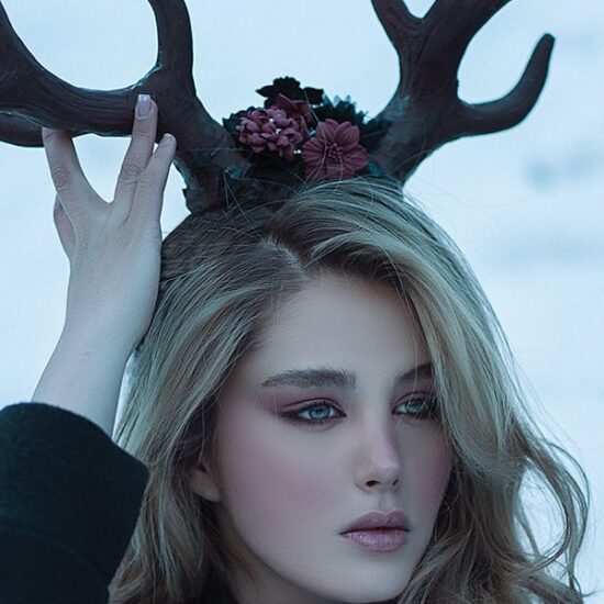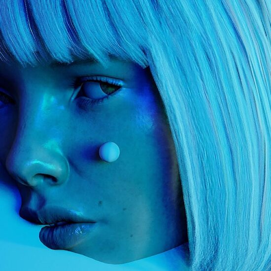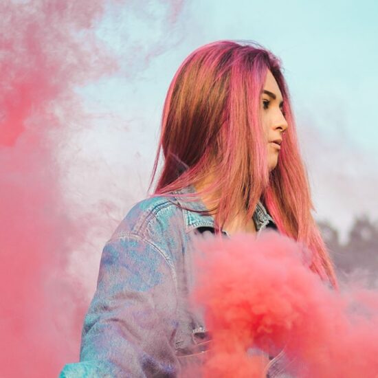 Woman wearing a blue on leather by pink smoke